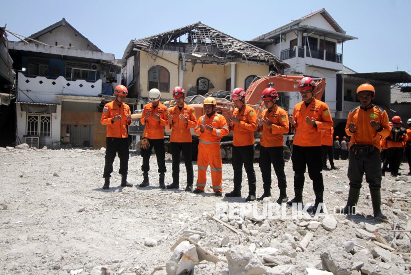 Tim Basarnas membacakan doa untuk korban bangunan mushalla di Pondok Pesantren (Ponpes) Al Khoziny di Kecamatan Buduran, Sidoarjo, Jawa Timur, Selasa (7/10/2025). Data BNPB, dari rangkaian operasi SAR yang telah dilakukan, jumlah korban secara keseluruhan tercatat sebanyak 165 jiwa, di mana sebanyak 61 meninggal dunia, 104 dinyatakan selamat dengan rincian; 4 masih dalam perawatan, dan 99 telah kembali kerumah setelah perawatan dan satu jiwa tidak memerlukan perawatan.