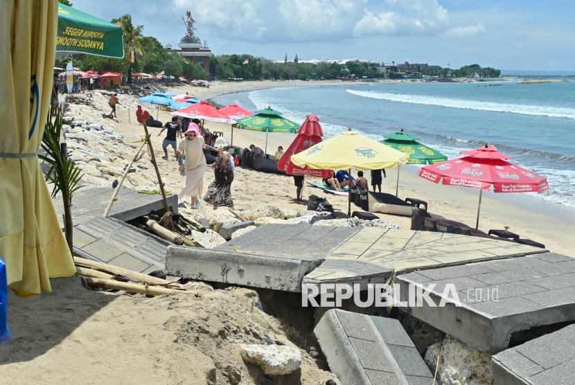 Wisatawan berjalan di dekat jalur pejalan kaki yang rusak di Pantai Kuta, Badung, Bali, (ilustrasi)