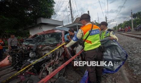 REPUBLIKA.CO.ID, SLEMAN — Petugas mengamati mobil yang tertabrak kereta 161 Bangunkarta di perlintasan antara Stasiun Brambanan dan Maguwo, Prambanan, Sleman, D.I Yogyakarta, Selasa (4/11/2025).