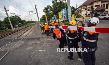 Petugas memperbaiki palang pintu perlintasan kereta pasca kecelakan yang melibatkan kereta 161 Bangunkarta dengan sejumlah kendaraan di perlintasan antara Stasiun Brambanan dan Maguwo, Prambanan, Sleman, D.I Yogyakarta, Selasa (4/11/2025). Kecelakaan yang melibatkan Kereta Bangunkarta dengan sebuah minibus dan dua sepeda motor itu mengakibatkan tiga orang meninggal dunia serta tiga orang luka-luka. (FOTO : ANTARA FOTO/Andreas Fitri Atmoko)