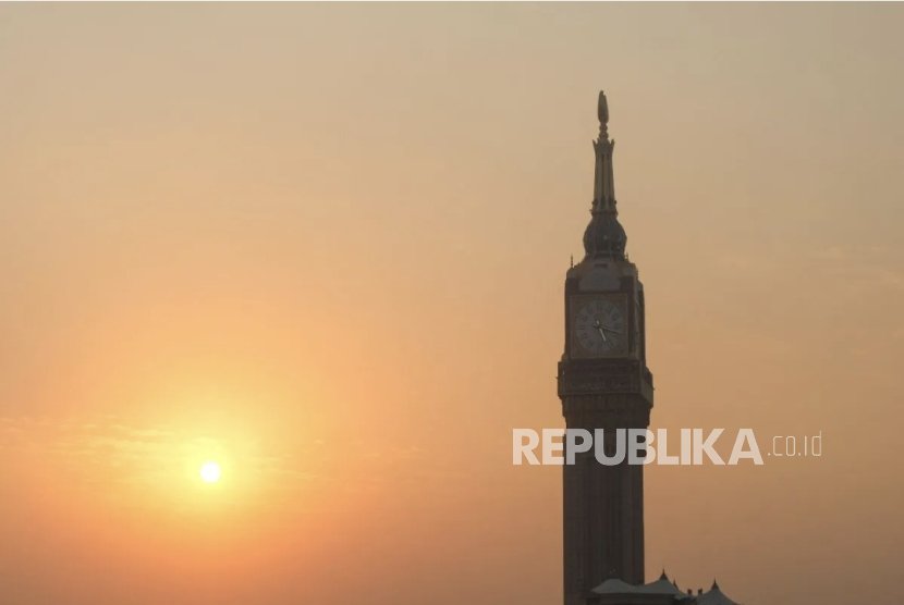 Sementara menara Abraj Al-Bait, atau yang dikenal sebagai Zamzam Tower, berdiri megah seolah menatap langsung sang surya yang perlahan tenggelam.