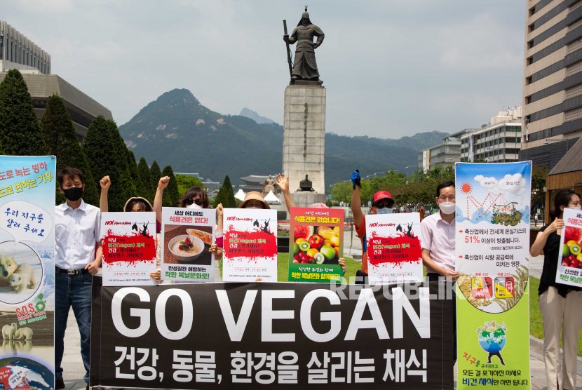 Anggota kelompok aktivis Vegan di Korea memegang plakat dan meneriakkan slogan-slogan selama protes menentang makan daging anjing, di Gwanghwamun Square di Seoul, Korea Selatan, 16 Juli 2020. Para pengunjuk rasa menyuarakan keberatan mereka untuk makan daging anjing dan meminta pemerintah untuk menetapkan undang-undang yang melarang konsumsi daging anjing.